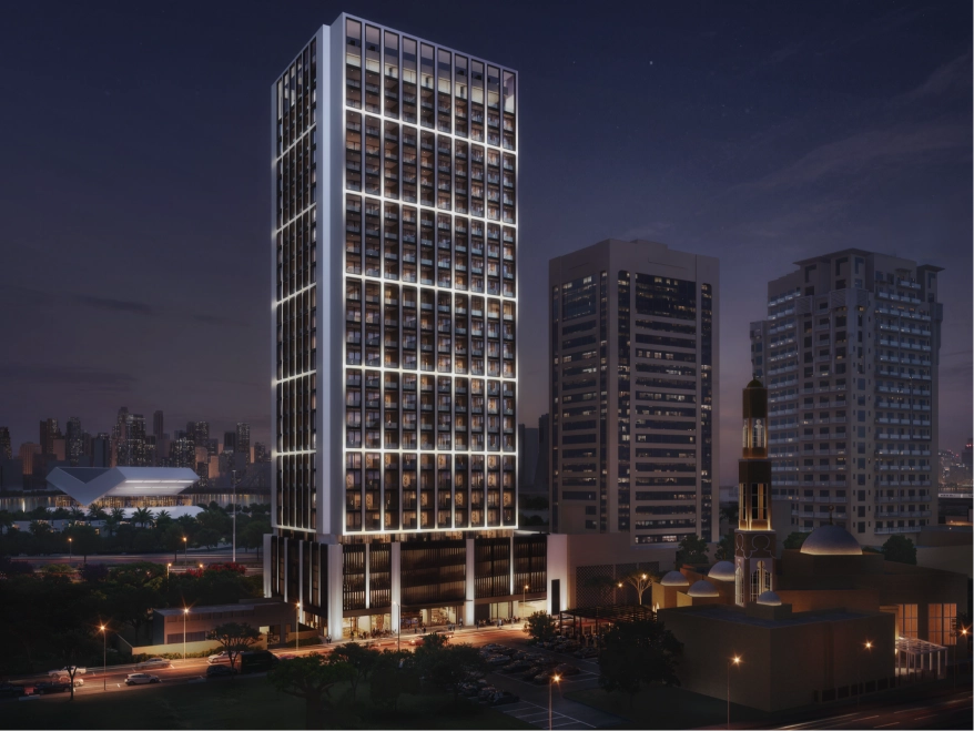 Developed by Binghatti, one of Dubai’s most recognized and innovative real estate developers, Binghatti Twilight reflects the brand’s legacy of architectural artistry and bold skyline-defining projects. The tower features a dynamic glass façade that interacts with natural light throughout the day, creating an ever-evolving visual identity. As sunlight shifts from dawn to dusk, the building transforms into a luminous statement overlooking Dubai Creek and the surrounding cityscape.