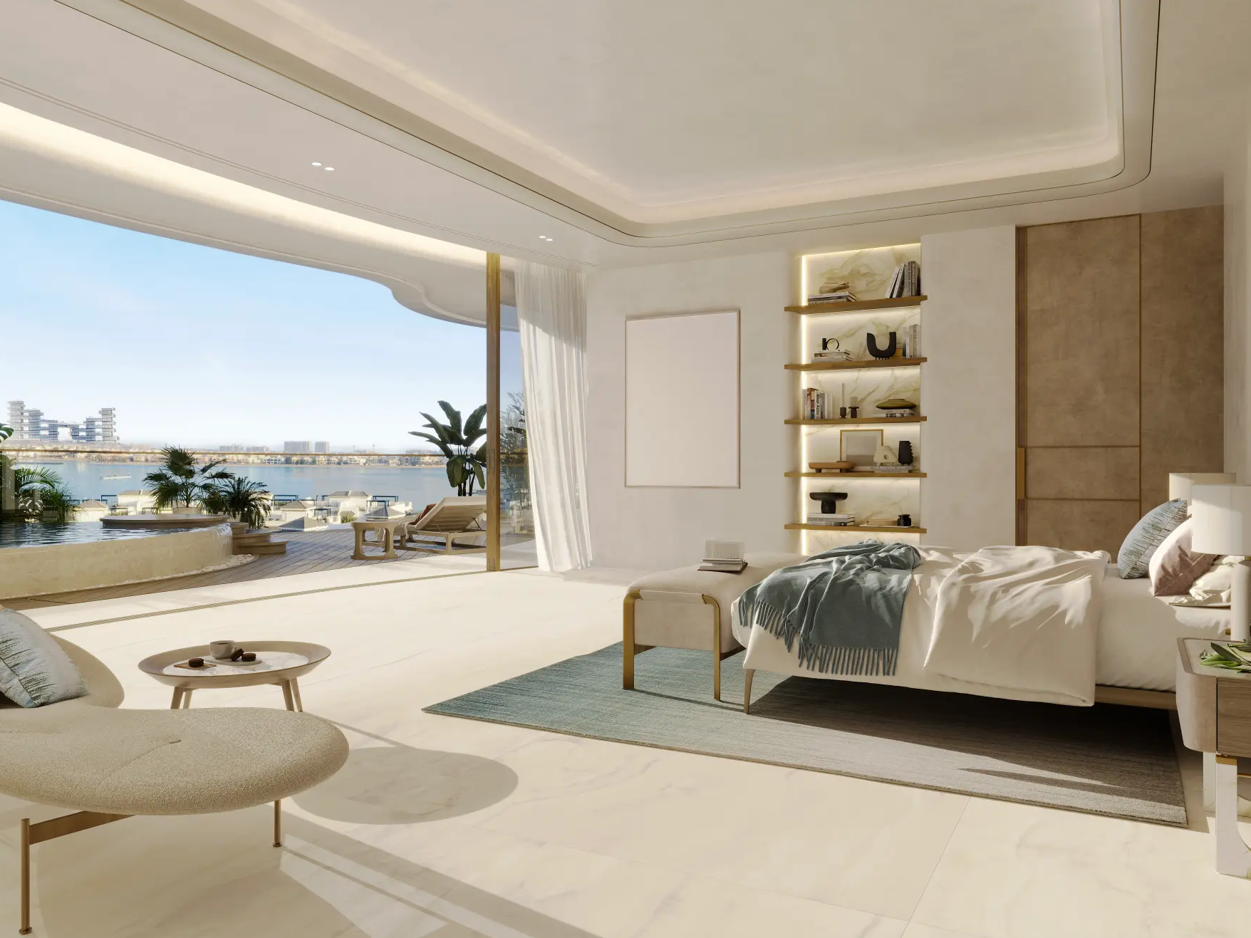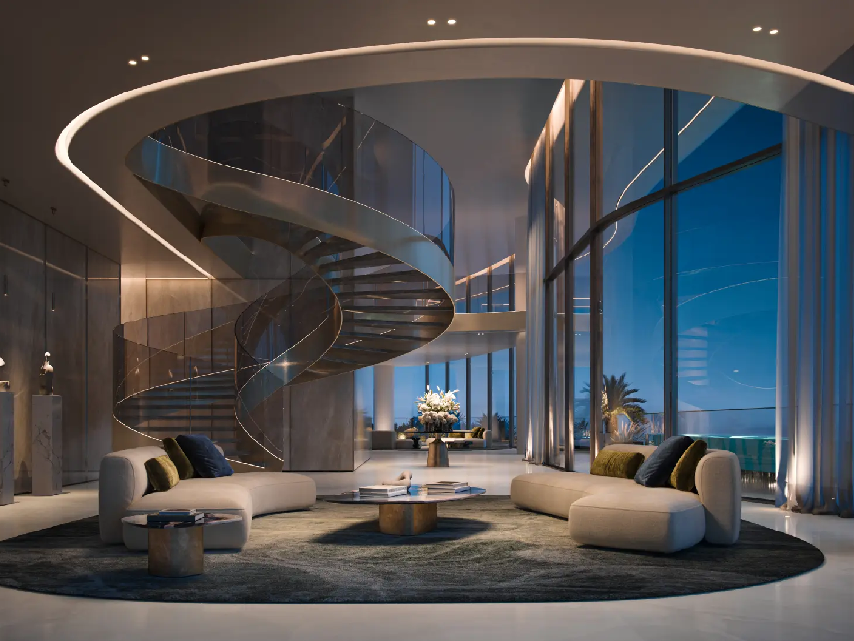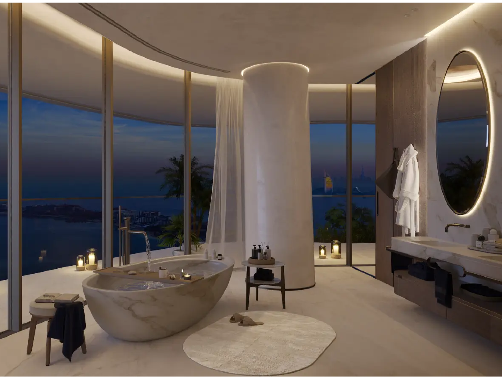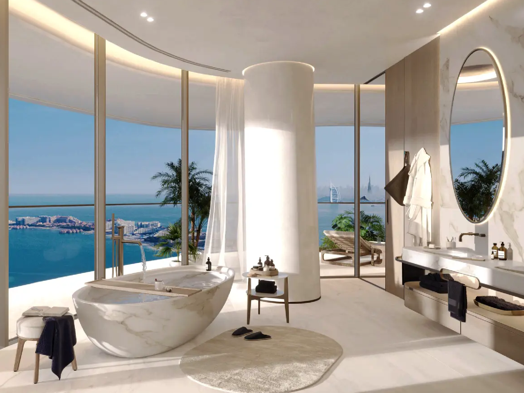 The residences are masterpieces of bespoke design. Featuring 2- to 6-bedroom apartments, 5-bedroom penthouses, and 7-bedroom duplexes, each home is meticulously crafted with premium finishes and attention to detail. Private terraces and pools provide tranquil retreats, while sweeping panoramic views of Burj Khalifa, Burj Al Arab, Palm Jumeirah, and the Arabian Sea frame every moment. Penthouses elevate the experience further with rooftop pools and uninterrupted 360° vistas.
