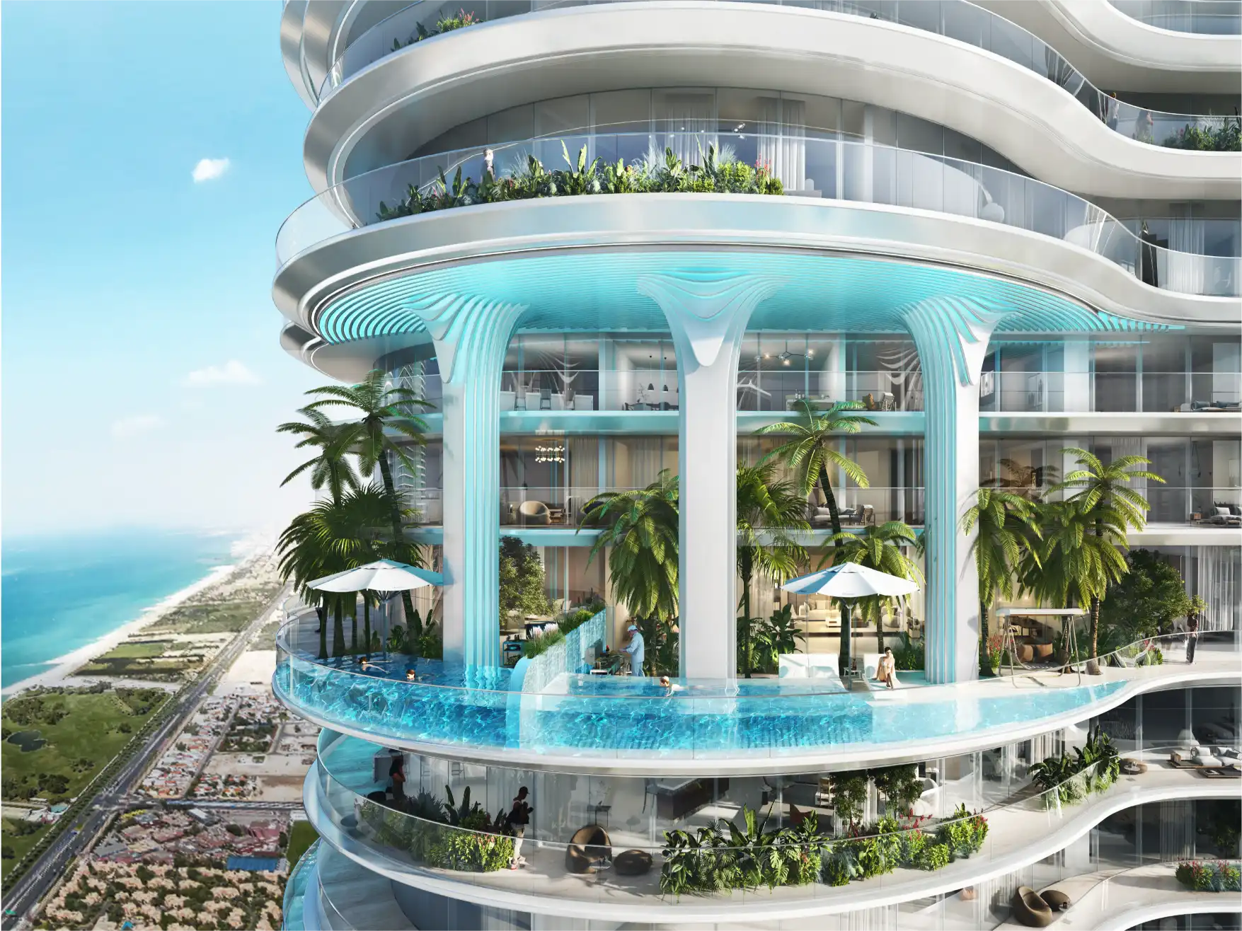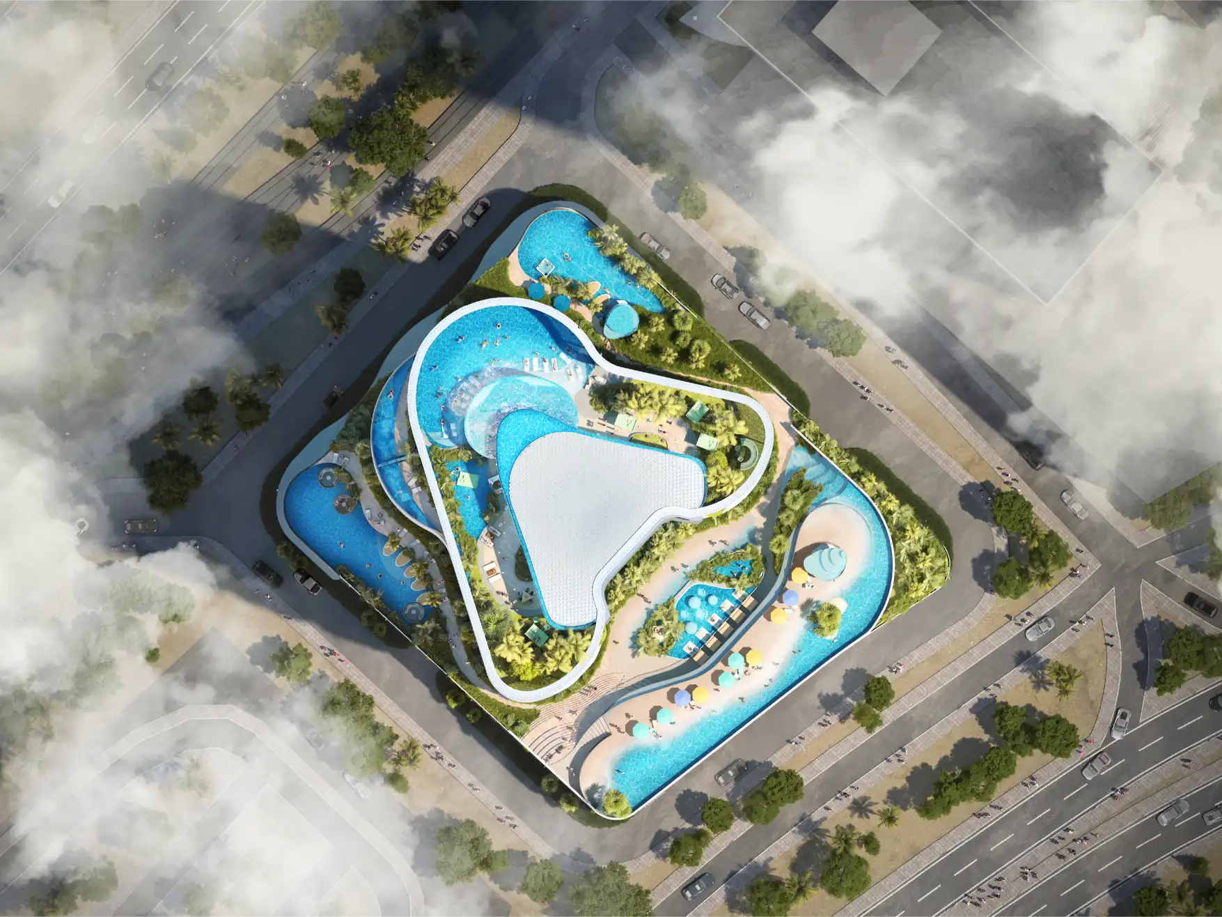 The podium rooftop introduces an unparalleled lifestyle inspired by island luxury. An artificial beach with soft sand and private cabanas creates a serene retreat high above the city, while the oasis lap pool, rain room, and artistic water installations set the tone for beauty and tranquility. Wellness and relaxation converge through the aqua gym, aqua spa, and sky floating beds, surrounded by lush palm gardens and elegant chill-out lounges that redefine relaxation at every level.