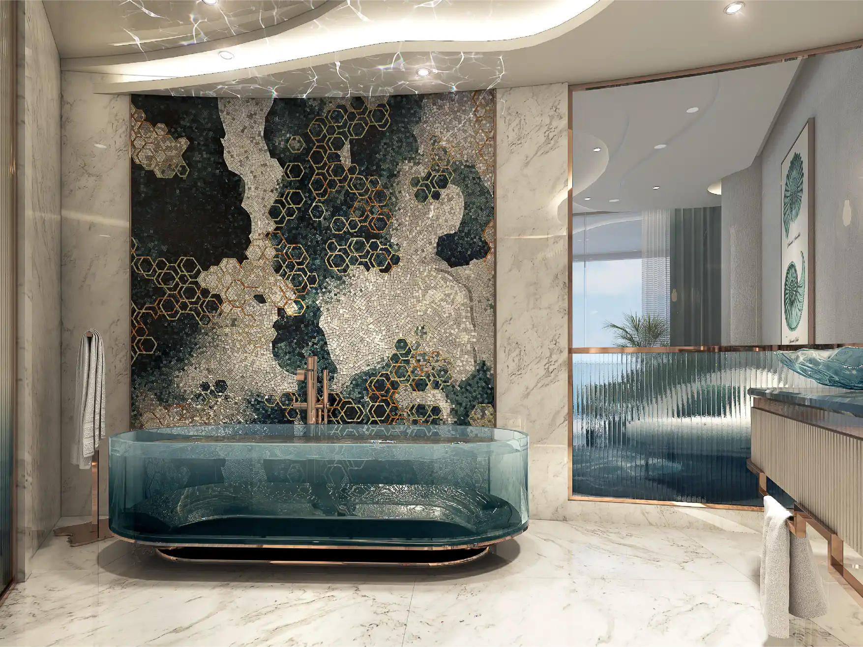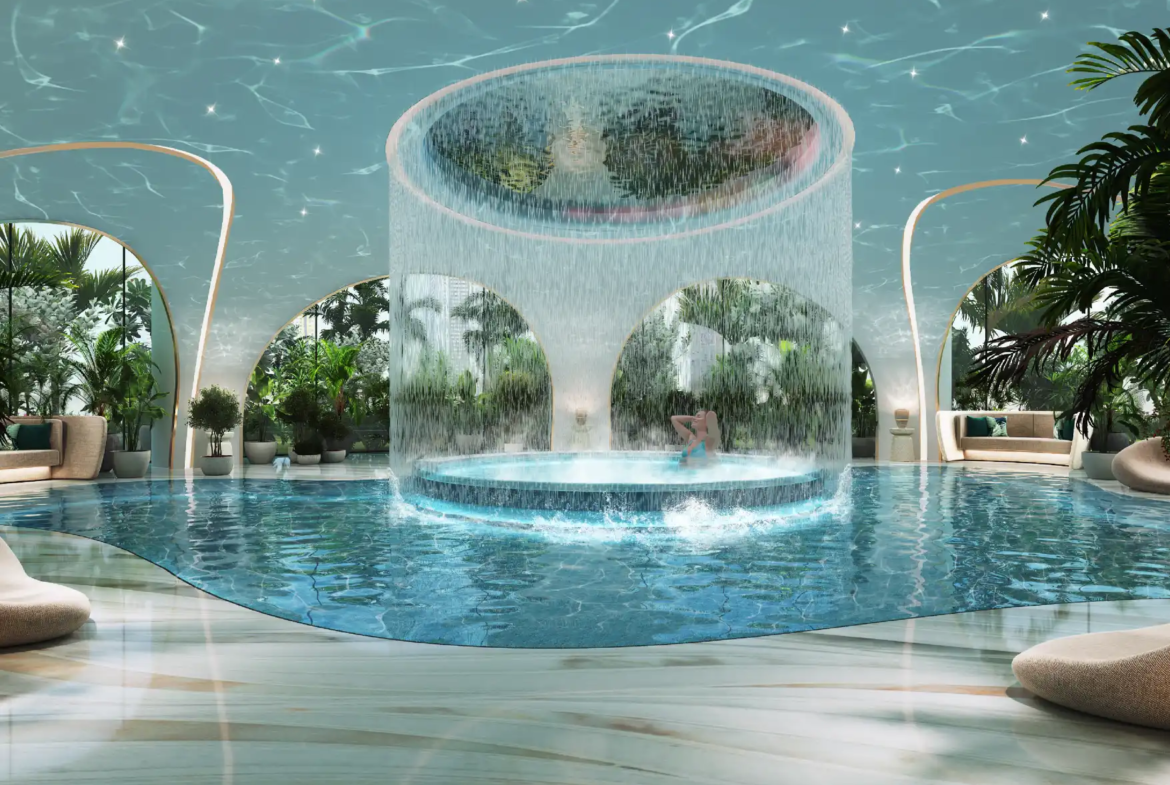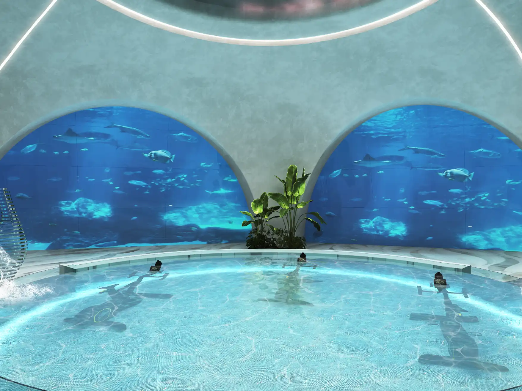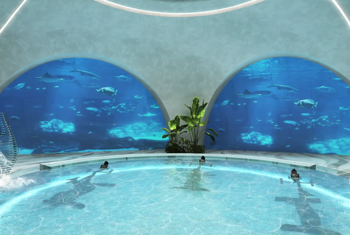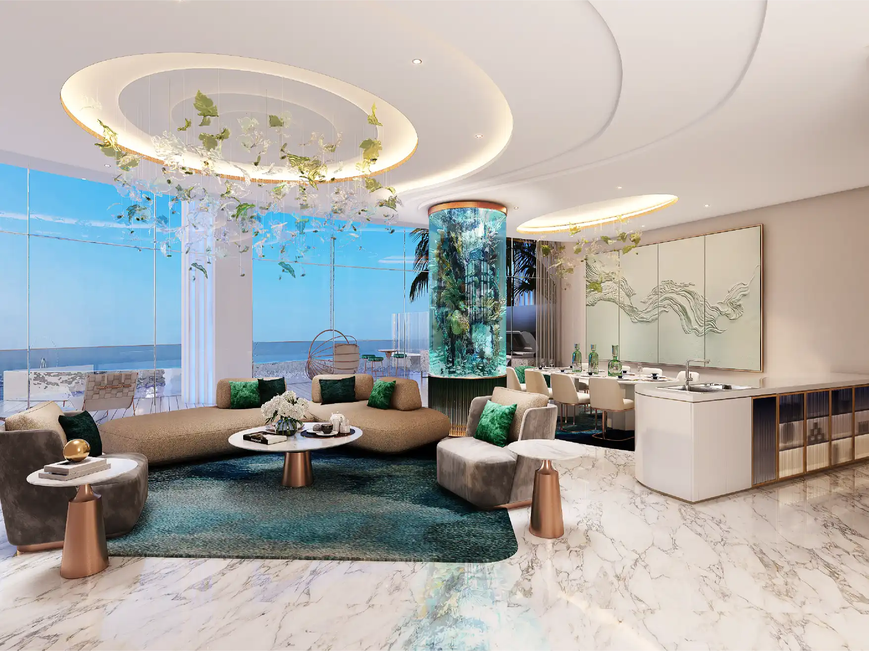 Inspired by the tranquil beauty of tropical islands and the healing essence of water, DAMAC Casa stands as a striking architectural statement. Its fluid, avant-garde design is defined by smooth curves, glass façades, and reflective surfaces that shimmer like sunlight dancing on the sea. From the captivating aquarium hall entrance to the aquatic-inspired interiors, every space is infused with a sense of movement and elegance, creating a dreamlike atmosphere that floats above the city.