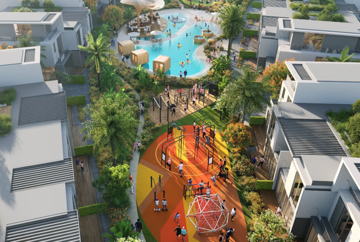 Surrounded by lush greenery and open spaces, DAMAC Sun City offers residents an exceptional lifestyle that blends wellness, recreation, and comfort. The community is thoughtfully planned with hiking trails, forest pathways, yoga zones, and an arena of monkey bars, providing ample opportunities to stay active, rejuvenated, and close to nature. At its heart lies a stunning water feature that infuses the surroundings with calm, creating a peaceful and relaxing atmosphere throughout.