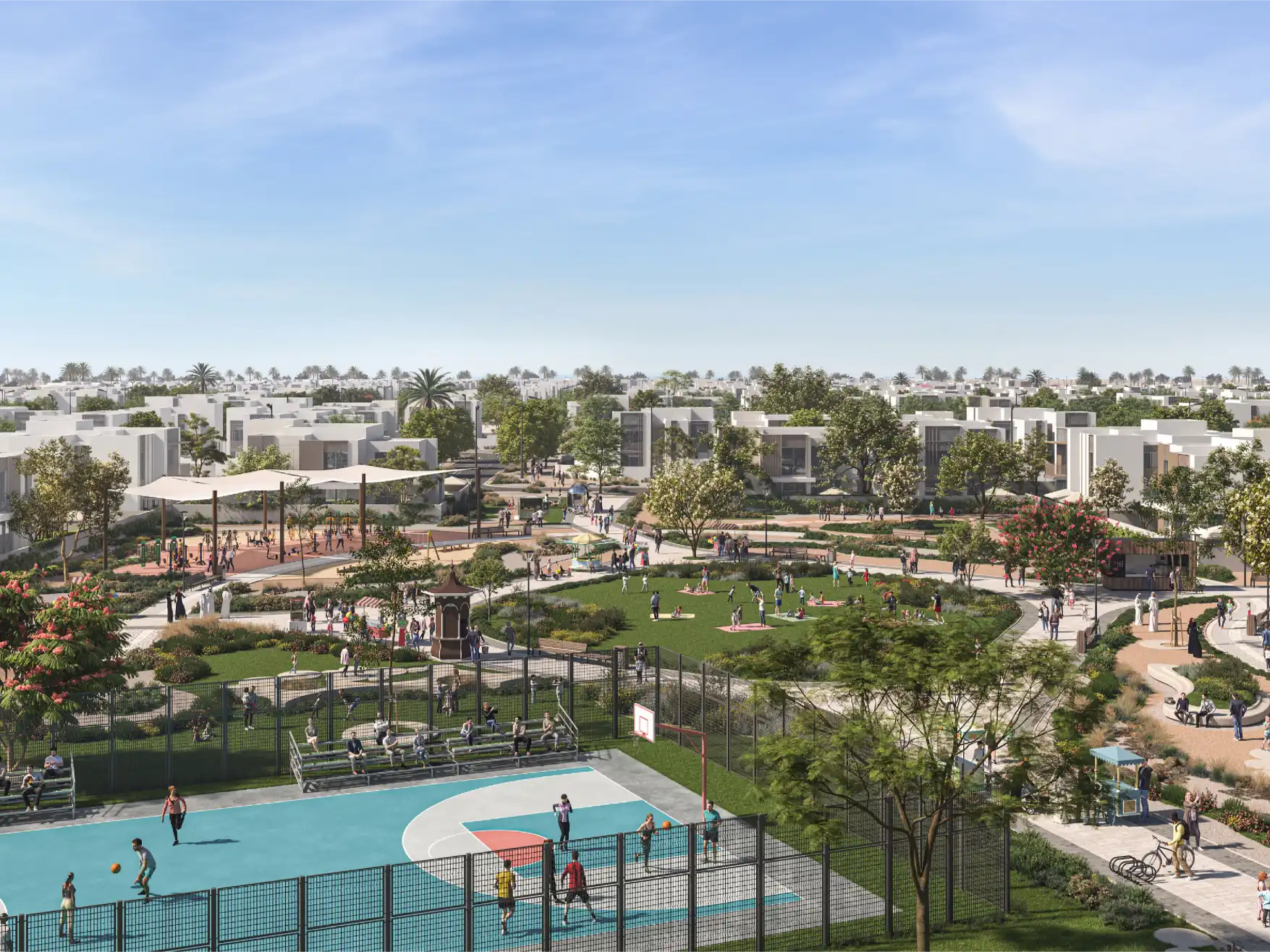 Spread across 2.4 million sqm, the master plan brings everything within reach—retail outlets, jogging and cycling tracks, green parks, picnic zones, adventure play areas, a community mosque, multipurpose sports courts, and more. Residents also enjoy modern facilities, including a gym, swimming pool, kids’ play areas, game room, yoga deck, flexible workspaces, and nearby schools, clinics, and nurseries.